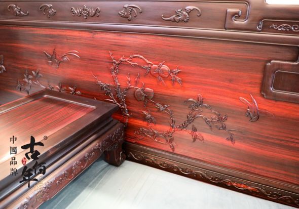 古佰年秉承精雕细刻的匠心精神,力求将每一个细节打磨到极致,诠释美轮美奂的古典风韵。工艺上,国宾沙发采用中国经典的榫卯构造,稳定牢固。沙发整体使用国画丝翎檀雕技艺,靠背中央浮雕栩栩如生,立体逼真。扶手内外两面均雕刻折枝松树,以形传神,宛如一幅富丽清秀的水墨画卷在眼前徐徐展开,雅韵扑面而来。