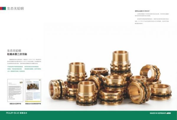 根据欧洲饮用水标准和与饮用水接触的材料的卫生评估,镀镍材质不再适用于自来水管道。所以德国洁水(AQUA-SCIE)严格选用了符合国际最高标准的 ECO BRASS®生态无铅铜用于饮用水的带有金属镶件的PP-R配件并在全球范围内应用。极大程度解决了水的重金属的污染问题,保证了水健康。