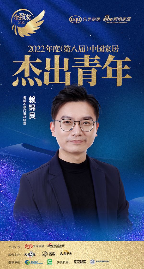 新浪家居讯 2022年12月26日,『趁势·再起——2022中国家居新时代盛典暨金致奖颁奖典礼』在云端盛大举行。由乐居家居主办,新浪家居承办的「2022(第八届)中国家居杰出青年」获奖名单正式揭晓,老赖不赖门窗赖锦良荣获「2022(第八届)中国家居杰出青年」称号。