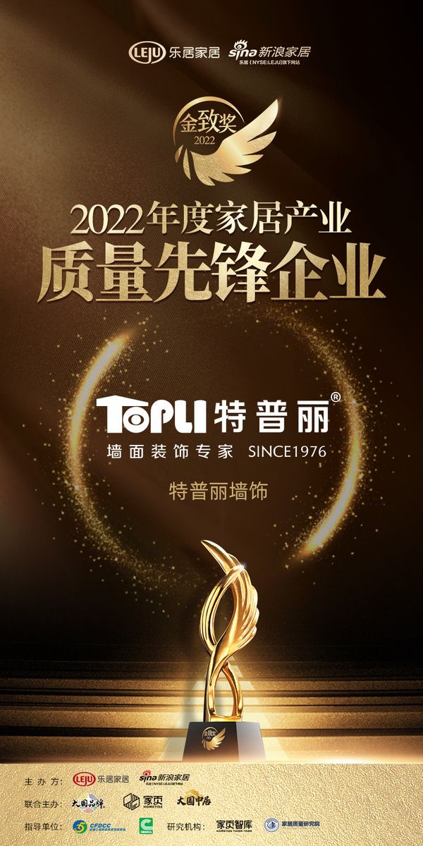 新浪家居讯 2022年12月26日,『趁势·再起——2022中国家居新时代盛典暨金致奖颁奖典礼』在云端盛大举行。特普丽墙饰荣获「2022年度家居产业质量先锋企业」称号。