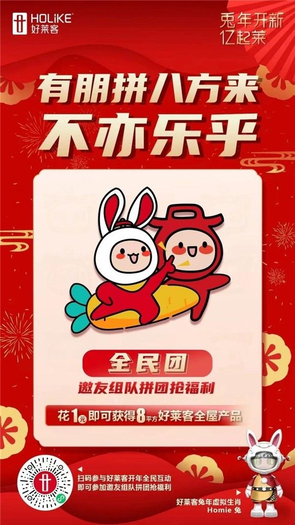基于此,好莱客延续品牌自身“潮”定位,以打造用户社群的思路,利用互联网优势提前为新春营销进行预热。通过焕新品牌数字虚拟IP打造新春贺岁版“Homie 兔”,成为行业第一个结合生肖做虚拟传播的品牌,撬动潜在消费群体对好莱客的认知壁垒。