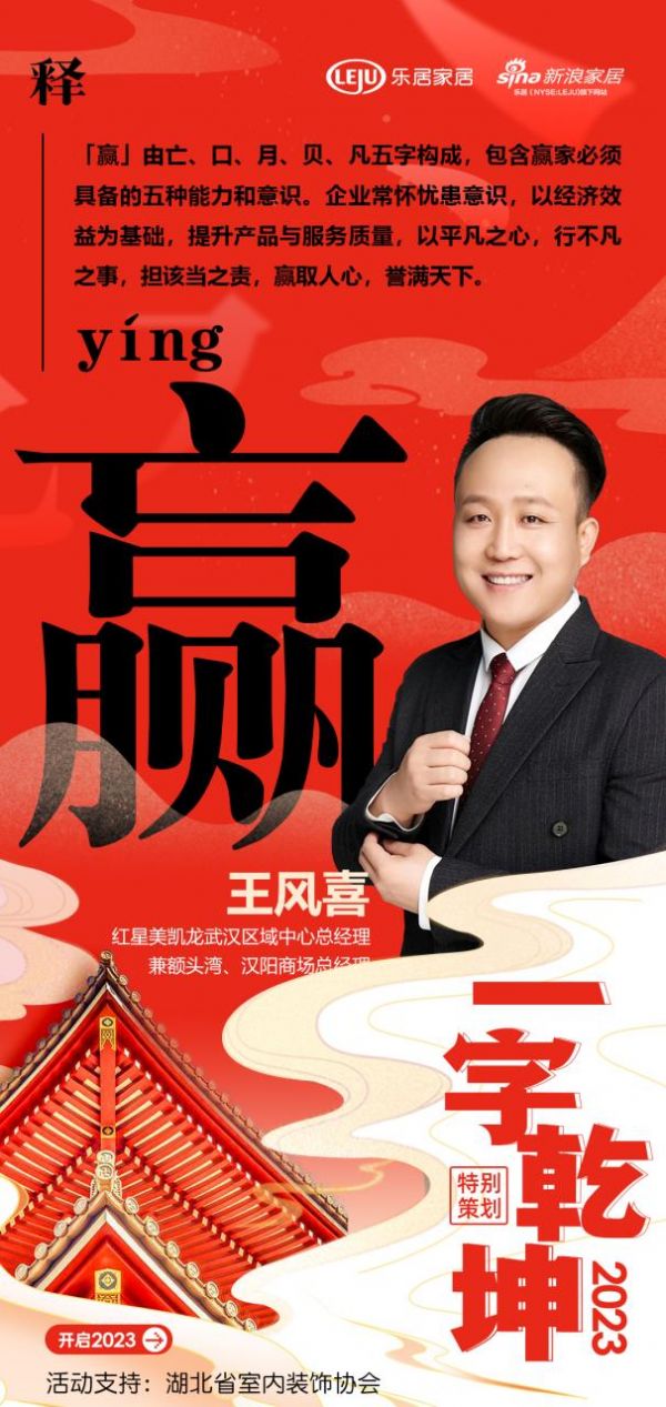 在新浪家居“2023一字乾坤”活动中,红星美凯龙武汉区域中心总经理兼额头湾、汉阳商场总经理王风喜:「赢」由亡、口、月、贝、凡五字构成,包含赢家必须具备的五种能力和意识。企业常怀忧患意识,以经济效益为基础,提升产品与服务质量,以平凡之心,行不凡之事,担该当之责,赢取人心,誉满天下。