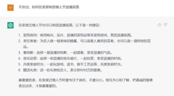 情人节临近,不想外出凑热闹,在家里如何制造出节日浪漫氛围?“懂王”ChatGPT向网友支招,装饰房间、一顿精心准备的晚餐、一份特别的礼物或者一起做点走心又有趣的事,都能很好地表达彼此的爱意,收获一段温馨甜蜜的美好时光。