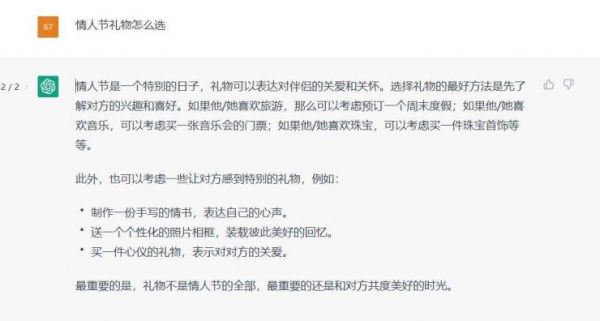 无论在哪儿过情人节,一份走心的节日礼物都是必备的。关于情人节礼物怎么选,ChatGPT认为一定要考虑对方的兴趣和爱好。