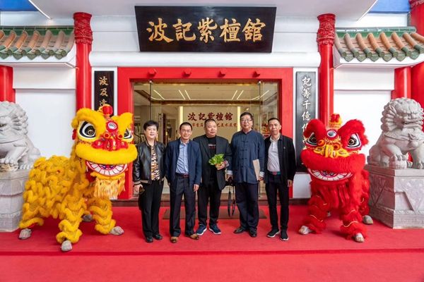 中国艺术研究院研究员、博士生导师,中国民协副主席苑利(右二),北京联合大学文化遗产研究所所长、北京非物质文化遗产研究基地主任顾军(左一),中山市文学艺术界联合会党组成员、市文联专职副主席卢曙光(左二),中山市民协主席李桂山与中国传统工艺大师、中山市民协副主席、波记紫檀馆董事长伍建波(右一)在波记紫檀馆前合影