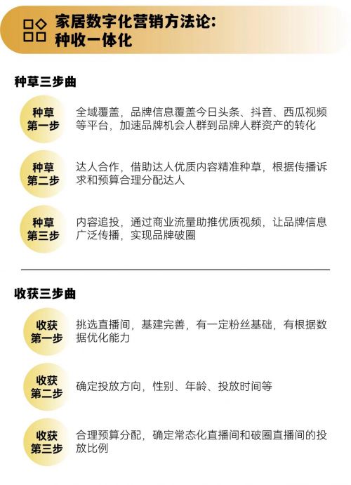 数字化营销的核心不在于投放的广度,而在于精度,家居企业需要学会生产好的内容进行品牌种草,再借用互联网平台工具对目标人群进行精准收获,让营销有的放矢,让投入高效回报。
