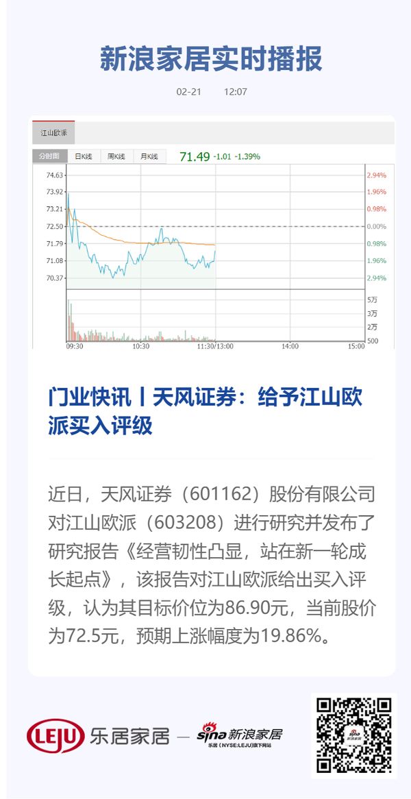 近日,天风证券(601162)股份有限公司对江山欧派(603208)进行研究并发布了研究报告《经营韧性凸显,站在新一轮成长起点》,该报告对江山欧派给出买入评级,认为其目标价位为86.90元,当前股价为72.5元,预期上涨幅度为19.86%。