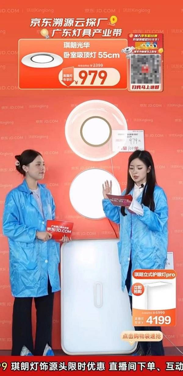 与此同时,广东灯具产业带等产业带商家,也将直播镜头移至工厂,把性能优越、性价比高的源头特惠好货推荐给千家万户。产业带代表品牌琪朗光华带来爆款卧室吸顶灯,日常价2399元,直播间仅售979元;琪朗立式护眼灯pro日常价6999元,直播间惊喜价4199元。具有品质溯源的实惠产品吸引了大批网友,直播观看量突破百万。