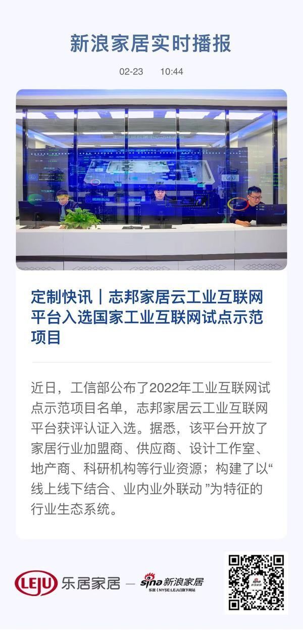 新浪定制频道讯 近日,工信部公布了2022年工业互联网试点示范项目名单,志邦家居云工业互联网平台获评认证入选。据悉,该平台开放了家居行业加盟商、供应商、设计工作室、地产商、科研机构等行业资源;构建了以“线上线下结合、业内业外联动”为特征的行业生态系统。