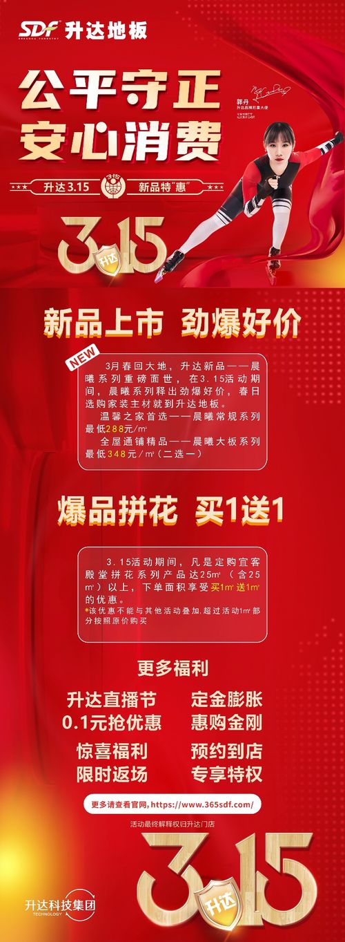 2022年初,升达地板与轮滑世界冠军郭丹牵手,借助北京冬奥会和明星运动员的东风,将升达品牌“健康新生活”的品牌理念传播向更广的市场。在即将到来的315中,升达地板携手形象大使郭丹,再次推出“公平守正 安心消费”的市场回馈活动,通过线下门店、线上直播等方式,为市场带来更多地板乃至全屋的解决方案,与消费者一起,让生活多点新花样。