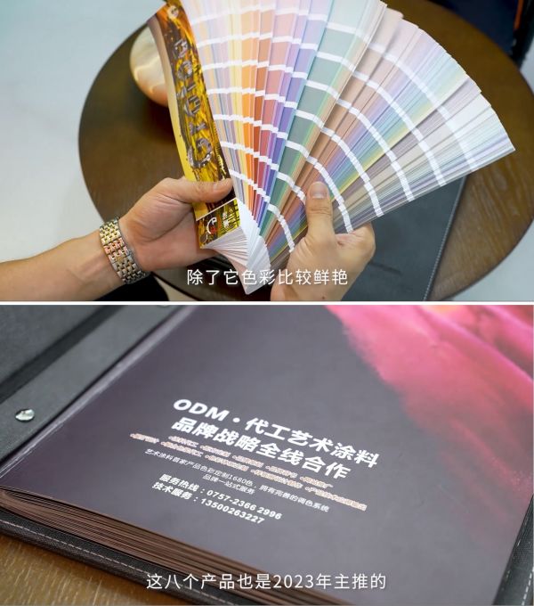 广东国涂安王飞:首先广东国涂有自己的涂料工厂,专业做OEM代加工,其次广东国涂还有自己的样板厂,来配套做样板册以及色卡。第三,广东国涂还有自己的印刷厂,做完样板册+色卡,包括公司的画册、手册,我们都可以做印刷,这3大板块目前能做到一条线全部完成的,在艺术涂料凤毛麟角,广东国涂算一家。