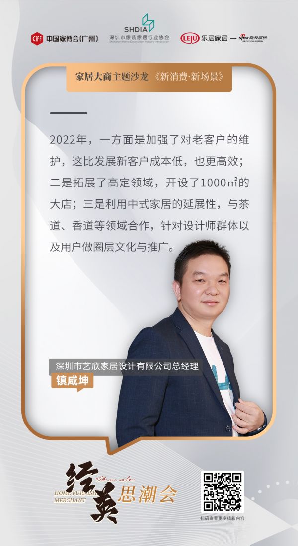 2023年2月23日,《经英·思潮会之新场景新消费》大商沙龙正式举行,本次活动由中国家博会(广州)、深圳市家装家居行业协会、新浪家居联合主办。沙龙中,深圳市艺欣家居设计有限公司总经理镇咸坤表示:“2022年,一方面是加强了对老客户的维护,这比发展新客户成本低,也更高效;二是拓展了高定领域,开设了1000m的大店;三是利用中式家居的延展性,与茶道、香道等领域合作,针对设计师群体以及用户做圈层文化与推广。”