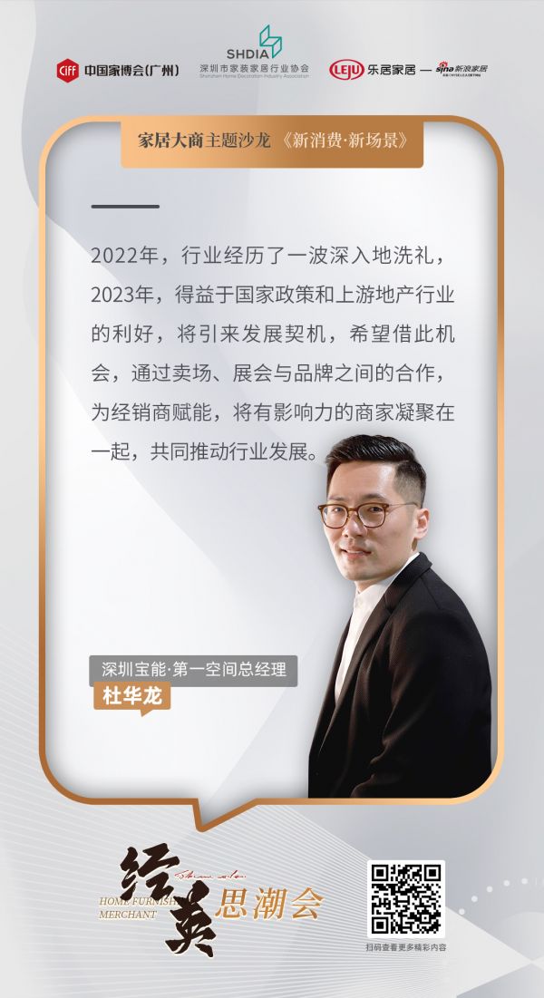 2023年2月23日,《经英·思潮会之新场景新消费》大商沙龙正式举行,本次活动由中国家博会(广州)、深圳市家装家居行业协会、新浪家居联合主办。沙龙中,深圳宝能·第一空间总经理杜华龙表示:“2022年,行业经历了一波深入地洗礼,2023年,得益于国家政策和上游地产行业的利好,将引来发展契机,希望借此机会,通过卖场、展会与品牌之间的合作,为经销商赋能,将有影响力的商家凝聚在一起,共同推动行业发展。”