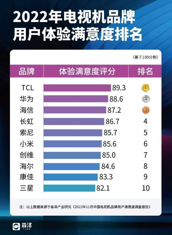 国内知名产业调研机构森泽《2022年中国电视品牌用户满意度调查报告》种显示,14.8%的用户对TCL好感度最高,在用户好感度排名第一。在消费者整体满意度评价中TCL得分为89.3分,排名第一。TCL品牌的复购率为81.0%、用户净推荐值达到为50.7%,同样位列第一。用科技为产品赋能、用画质满足用户,是TCL收获市场销量与用户口碑的关键因素。