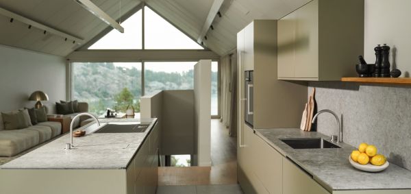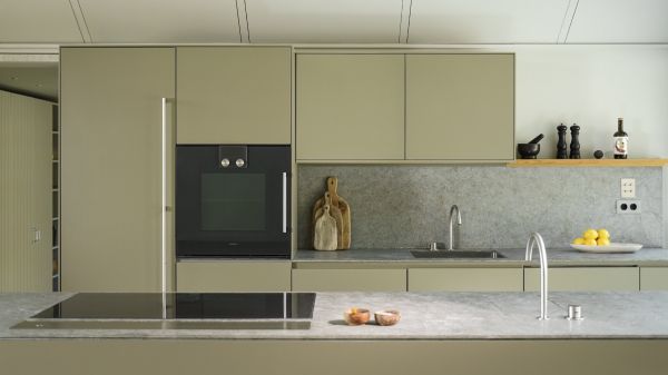 嘉格纳的极简美学和自由组合,与现代设计完美融合。冰箱、洗碗机隐入灰绿色柜体,烤箱金属旋钮于空间增添一抹复古。