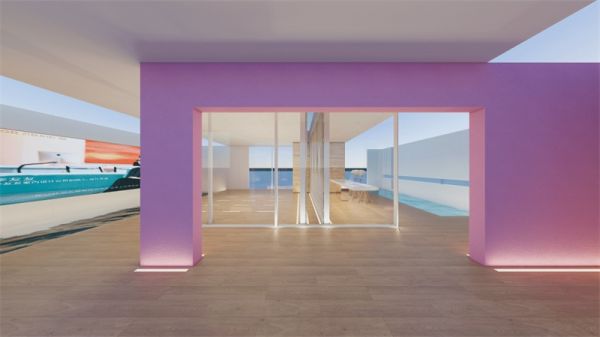 色彩我考量了三个颜色,第一个蓝色,代表天空和水;第二个白色,代表着希望、丰富性、多变性;第三个粉色,代表饱满跟梦幻。光跟色彩的组合演绎下,独特的静谧花园就在眼前。