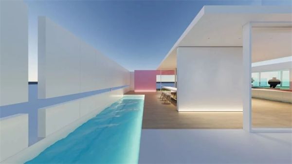 空间的结构跟景观的视线在水的作用下会相互渗透,水作为连续性的装置艺术,给人感觉是平静的,旁边的粉色长廊和水之间形成非常强的色彩对比。
