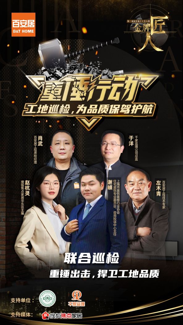 百安居启动新年首期“重锤行动”,联手行业协会、监理机构、媒体、消费者,共同打响工地巡检第一枪,将专业性与大众性相结合,全方位展现百安居标杆工程,监督并激励家装行业良性发展。