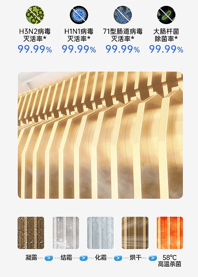 TCL小金聆智慧语音空调很好地解决了这一健康痛点,第五代高温自清洁,在关机状态下启动“清洁”功能后,空调便开始自动清洗,历经“凝露结水-快速结霜-化霜清洁-58℃高温烘干杀菌”5大步骤,35分钟还原内机洁净,对H1N1病毒、H3N2病毒、71型肠道病毒、大肠杆菌的灭活率、除菌率高达99.99%。