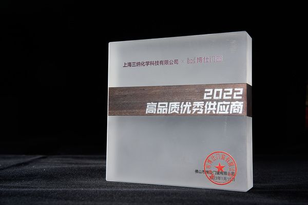 上海三纳化学科技有限公司2022年为博仕门窗提供了优质、稳定的组角胶、端面胶产品及服务。2023年3月9日,上海三纳团队一行到访博仕门窗总部,博仕门窗研发总工程师李德初向上海三纳广东大区经理管昊颁发“2022高品质优秀供应商”奖牌,以表示对上海三纳产品服务的认可、长期支持的感谢,并展望未来更深度的协同与合作。