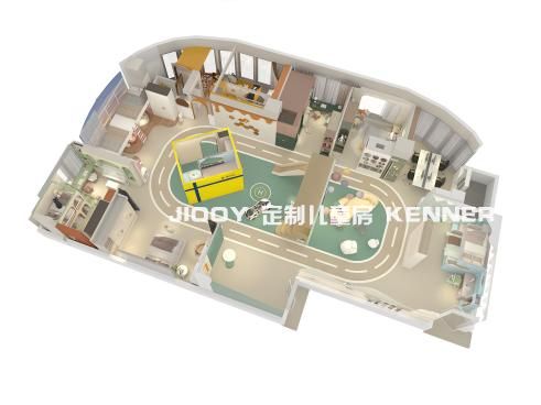 JIOOY定制儿童房旗舰展厅主要由八套原创定制儿童房新品、一套专业儿童房卫浴空间、品牌文化区、专业样块门板展示区、温馨洽谈区以及办公区组成。