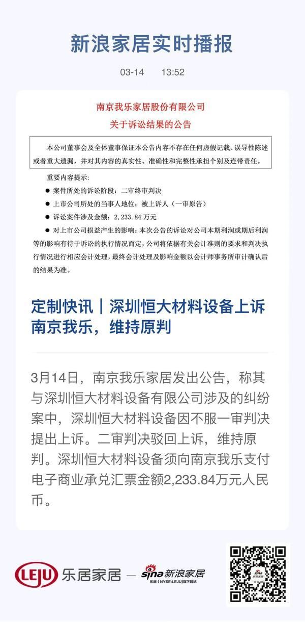 新浪家居定制频道讯 3月14日,南京我乐家居发出公告,称其与深圳恒大材料设备有限公司涉及的纠纷案中,深圳恒大材料设备因不服一审判决提出上诉。二审判决驳回上诉,维持原判。深圳恒大材料设备须向南京我乐支付电子商业承兑汇票金额2,233.84万元人民币。