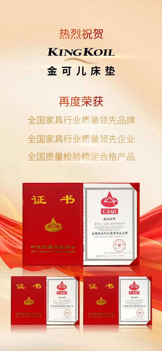 在中国质量检验协会开展的2023年“3.15”国际消费者权益日“产品和服务质量诚信承诺”主题活动中,金可儿(上海)床具有限公司及旗下KINGKOIL金可儿、hotel@home金可儿酒店星选、ibed by KINGKOIL金可儿智能系列、KINGKOIL Home金可儿寝具定制系列、KINGKOIL KIDS金可儿成长系列、LifeBalance睡乐倍品牌床具、床垫等六大系列产品获得了“全国家家具行业质量领先企业”、“全国家具行业质量领先品牌”、以及“全国质量检验稳定合格产品”等三项认可。