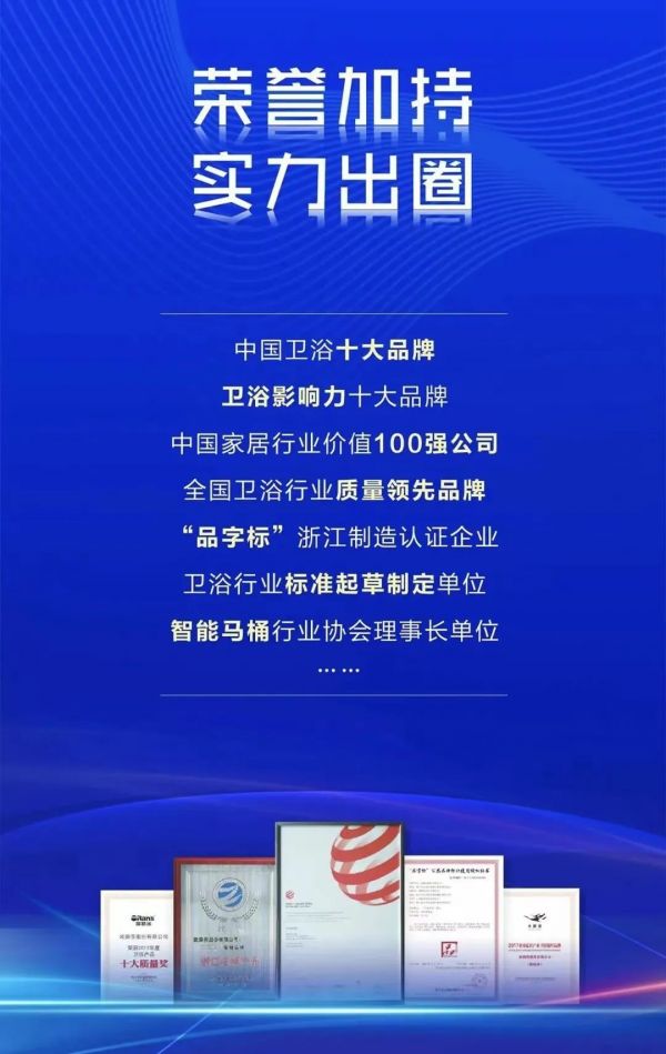 同时还获得了“中国节水产品认证”“绿色环保企业认证”,并先后被评为“全国质量、信誉双保障示范单位”、“全国消费者用户满意企业”、“中国卫浴十大品牌”等荣誉称号。