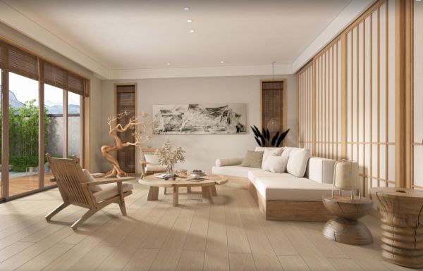 在新中式空间总,人们打破了红色系、棕色系配色的方式,转而选用了更清爽自然的白木色系来进行搭配。这样的空间是一种缓缓扣人心扉的静谧淡雅质感也更符合当代年轻一代的审美视角。白木空间不需要过多复杂的搭配,一茶一坐之间尽显新中式的格调。木雕装饰以及边桌古朴的造型渲染了新中式古朴自然氛围。卢森地板阿波罗橡木原木色,花纹清晰自然。在白木结合的空间中,卢森地板阿波罗橡木很好地塑造了安静的舒适感。