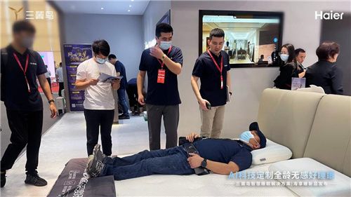 睡中:睡眠检测仪实时检测用户睡眠状态,“智家大脑”会自动将空调设为睡眠模式,并根据实际情况联动空调调节温度、风向,开启加湿器,防止用户被冻醒或热醒。同时,海享睡新品AI智适应床垫自动感应用户睡姿变化及打鼾等情况,主动调节床垫最佳承压方案,贴合身体曲线,有效减缓因寝具不适带来的频繁翻身,延长深睡时长。