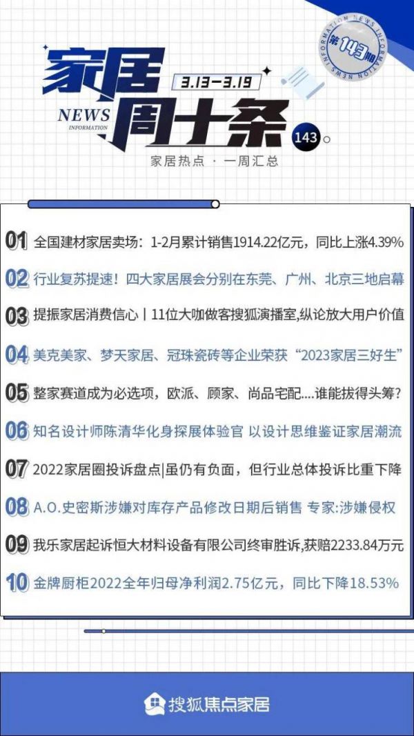 家居周十条丨1-2月卖场销售额同比上涨4.39%、A.O.史密斯涉嫌侵权…