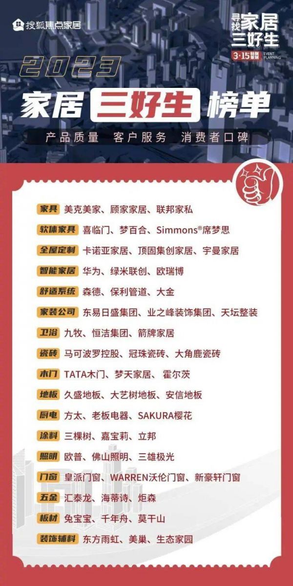 2023年,家居消费迎来多项政策利好,以自身高质量发展提振家居消费信心成为每一家家居企业的重要课题。搜狐焦点家居在3·15国际消费者权益日来临之际,重磅发布“寻找家居三好生”主题活动,在产品质量、客户服务、消费者口碑三维度,综合评定企业是否具备“三好生”的特质。针对卫浴、瓷砖、厨电、地板、涂料、木门、全屋定制、智能家居等细分行业,搜狐焦点家居经过线上投票和终端消费调查,最终评选出家居三好生优秀品牌。