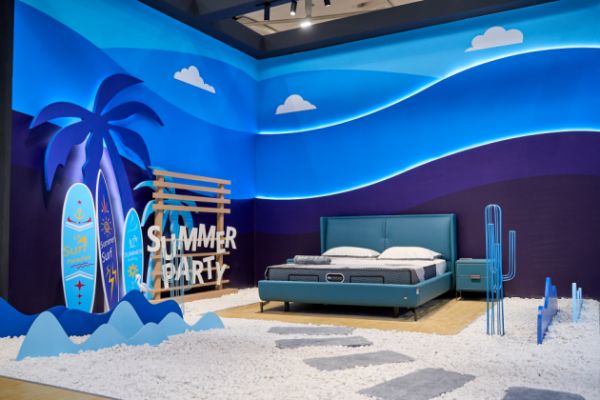 在活力无限的夏日主题展区, 海滩的清新氛围与冲浪元素的动感魅力相结合,以海天相接的蓝色渲染,布置了沙滩、海浪、冲浪板等元素,营造出虚实交织的清新空间,吸引了众多年轻客群沉浸式探索全新睡眠概念空间的无尽魅力。