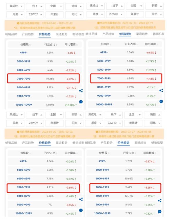 笔者做了一番搜索,在线上,一些主打电商的品牌价格已经非常离谱,线上均价本应在8000+的蒸烤一体集成灶,只有5600,甚至更低的价格。通过比较奥维云网(23W07-W10)近四周的数据,笔者发现,7000-7999价格段连续4周出现下调,幅度最高同比上周减少-4.48%。线上也是如此,这一价格段机型价格持续走低。此外,今年1-2月,集成灶行业整体呈现出价减量增态势,奥维云网数据显示,部分行业主流品牌如亿田、美的、华帝、帅康其线下产品均价降幅超1000元。