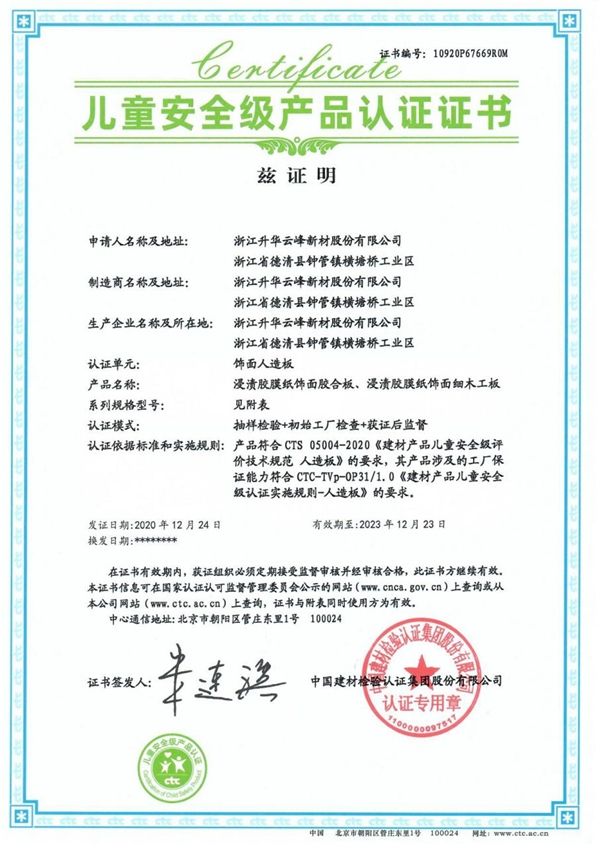 2018年,莫干山板材成为全国首批通过“绿色产品”认证的企业,其胶合板、生态板、细木工板等品类产品能合法使用绿色产品标识。2020年,莫干山板材获得中国环境标志产品认证和“儿童安全级产品”认证。
