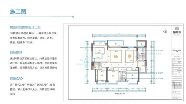 特别是在施工图上,酷家乐独创在线图纸设计工具,做到3D模型与2D图纸联动,一处修改处处修改。不仅如此,还能实现标注避让,持续监控标注修改比例,提高自动标注正确性;并且提供批量标注编辑、图例替换等方式,提高修改便捷性,设身处地地帮助设计师减轻学习负担,提高设计效率。