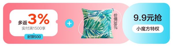 3月23日-24日00:00期间,还可9.9元购买小魔方特权礼包,3月24日当天付款,即可享受实付满1500返最高500元优惠,并赠送精美抱枕一个。