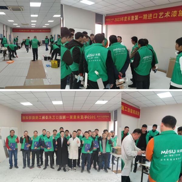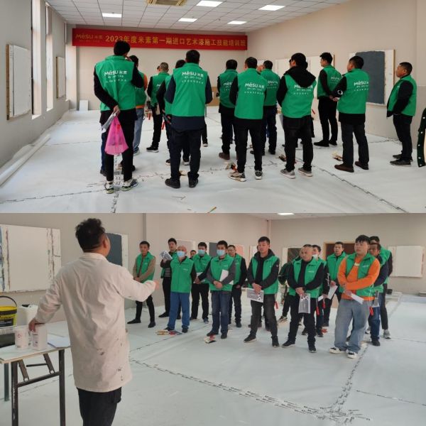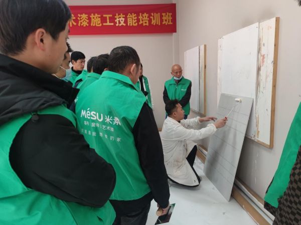 首先是讲给学员听,详细介绍米素的品牌发展进程与企业文化,在理论培训的过程当中讲解艺术漆的发展趋势和理论课程,学习艺术漆的产品性能,工艺步骤,施工效果等;其次是做给学员看,对艺术漆的工艺进行拆解细分教学,并现场演示操作要领;然后是学员做给老师看,大家从底漆、面漆到罩面施工,从动作生硬到轻车驾熟,在几天的学习过程中掌握施工工具、工序、材料性能等,每位学员均动手实际操作,体验艺术漆的施工魅力;最后是指导和纠正,老师一对一施工教学并每天点评及总结。