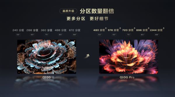 TCL Q10G Pro尺寸覆盖55~98英寸,通过更强一代Mini LED背光技术,背光分区数量成倍提升,55/65/75/85/98英寸五个尺寸版本分别搭载了480/576/720/896/1344个分区,在同尺寸电视中均位居前列。