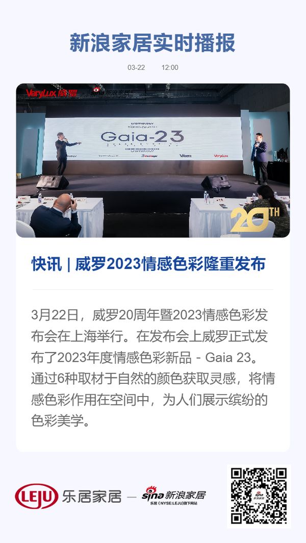 3月22日,威罗20周年暨2023情感色彩发布会在上海举行。在发布会上威罗正式发布了2023年度情感色彩新品-Gaia 23。通过6种取材于自然的颜色获取灵感,将情感色彩作用在空间中,为人们展示缤纷的色彩美学。