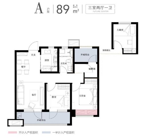 89㎡三室两厅一卫,户型方正,使用率高,明厨明卫,干湿分离,虽然面积小,但却非常实用,性价比直接拉满;