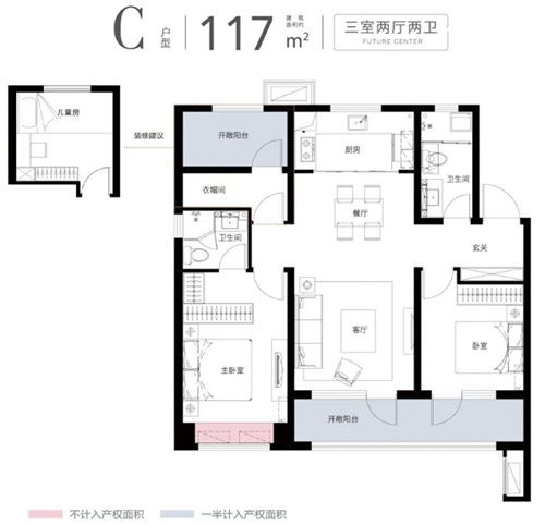 117㎡三室两厅两卫,户南北通透,每个房间采光通风极佳,同时餐客厅一体彰显大气,没有暗房暗卫,老人房和其他房间分开,不会因为老人作息不同而被打扰。