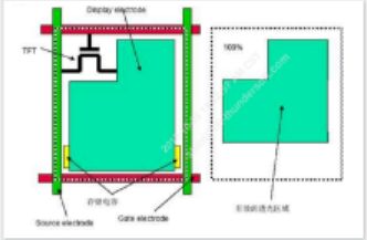 开口率是指整个屏幕真正可以透光的面积占总面积的比率,换句话说,就是光能透过的有效区域的比例。在液晶屏中,当光线经由背光板发射出来时,并不是所有的光线都能穿过面板。因此有效的透光面积就只剩下图中显示的绿色区域,其他区域由于被这些走线等等遮挡住,是无法正确显示到屏幕上形成画面的。