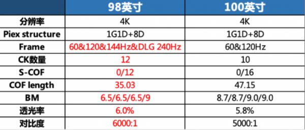 在同等的4k分辨率下,98英寸的CK时钟数要高过100英寸的,上面原理部分也解释了,更高的CK时钟数会让充电速度更快,进而最终的色彩准确度、均匀性都有更好的控制;透光率即是上面提到的开口率,更高的透光率也会让98英寸屏幕比100英寸屏幕带来更多性能上的优势。