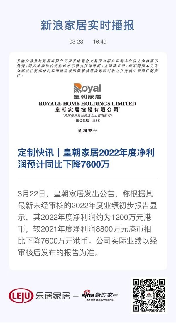 定制快讯|皇朝家居2022年度净利润预计同比下降7600万