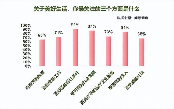 根据《美好生活报告》数据显示:在“关于美好生活,你最关注的三个方面是什么”的问题中,「更舒适的居住条件」成为受访者最为关注的方面,占比达到为91%。