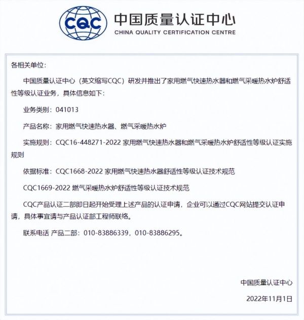 在此背景下,中国权威认证机构 -- 中国质量认证中心(简称CQC)组织了行业内研发、制造、检测、认证等专家以及电商代表(京东等大型电商平台),针对产品热水温度、稳定时间、抗风能力、停水温升等十余项影响舒适的指标进行量化、划分、汇总,制定了我国第一部面向全国的舒适性等级规范—— CQC1668-2022《家用燃气快速热水器舒适性等级认证技术规范》。