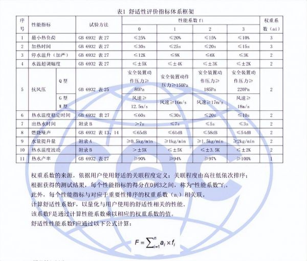 舒适性等级认证的评价体系是:将影响用户热水使用舒适的性能指标进行关联程度定义,依据关联程度由高往低依次排序,并根据每个性能指标与对应于重要性排序的权重系数(ai)相关联,计算舒适性性能系数F,以量化与用户使用的舒适性相关的性能。