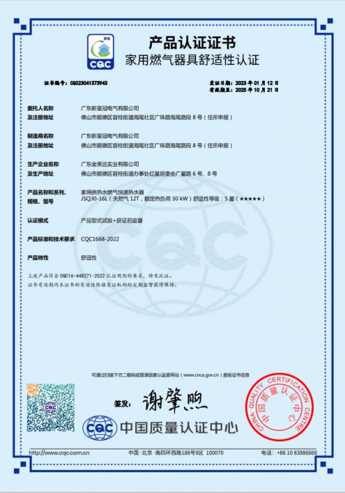 2023年1月12日,皇冠恒温系列JSQ30-16L完成全部测试并顺利通过技术规范要求,成CQC认证发布后首批通过获得最高等级认证——舒适性五星级产品。