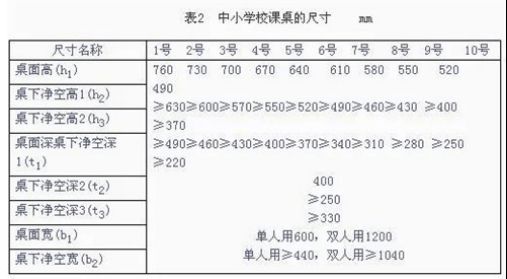 为了规范课桌椅的尺寸,2002年,相关部门专门出台了《学校课桌椅功能尺寸》的国家标准,将桌面宽(左右方向)确定为600mm(单人用)和1200mm(双人用),并根据学生身高将课桌和课椅分为10种大小型号。对于一些特殊身高的学生,学校则可另行调配课桌凳。2010年,工信部对QB/T 3916—1999《课桌椅》标准进行修订,对课桌椅的分类、具体技术要求进行了较为详细的规定,沿用至今。2010年以后,升降课桌椅逐渐成为学校标配。